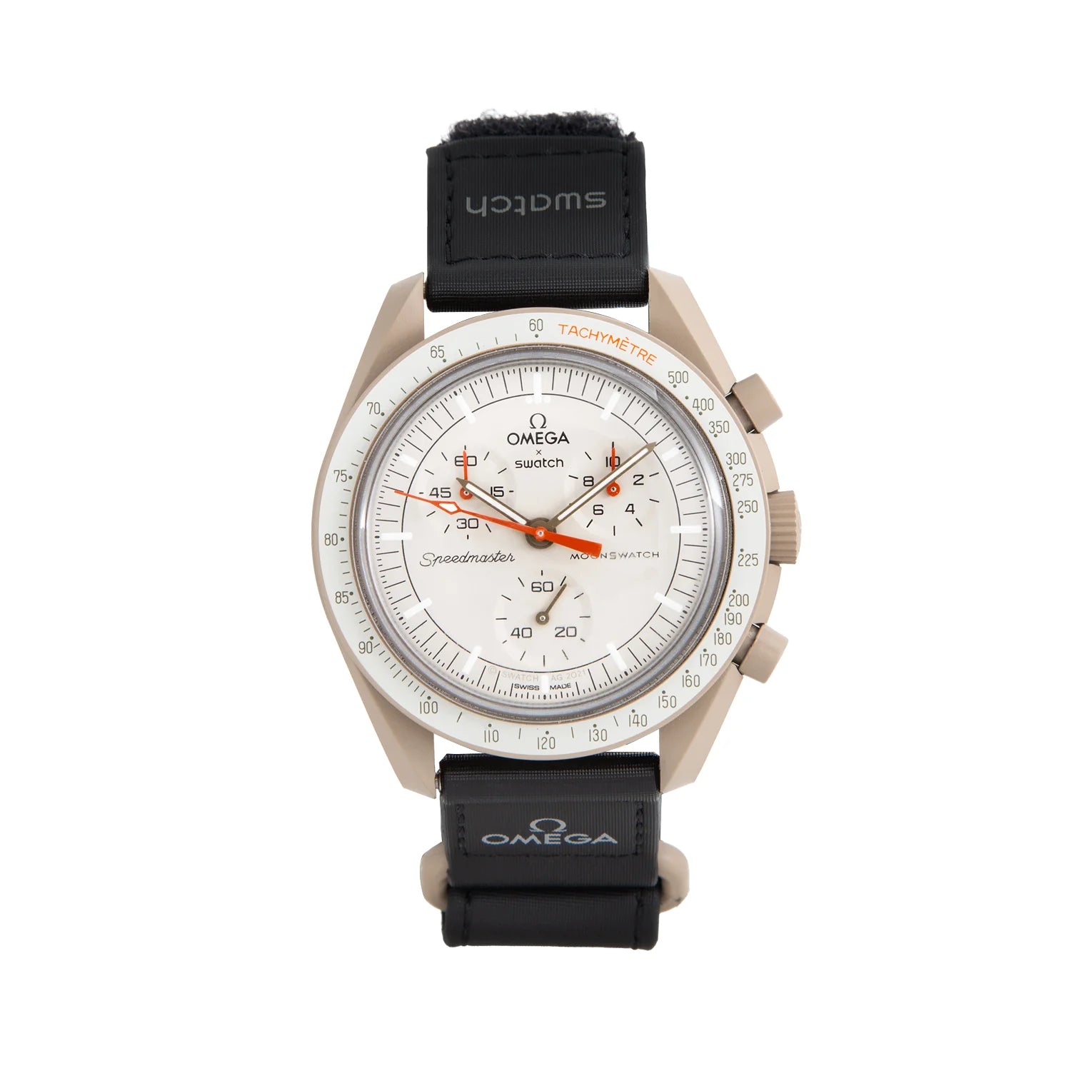 Descubre uno de los modelos más codiciados de la colaboración MoonSwatch: el “Mission to Jupiter”, con su estética cálida en bioceramic beige y detalles en naranja que rinden homenaje al Speedmaster “Ultraman”.